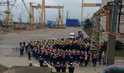 În această dimineață, câteva sute de salariați s-au adunat la pavilionul administrativ din incinta Șantierul Naval Damen din Mangalia pentru un protest spontan. Angajații sunt nemulțumiți deoarece ieri, fiind ziua de plată a salariilor, nu și-au încasat drepturile salariale.