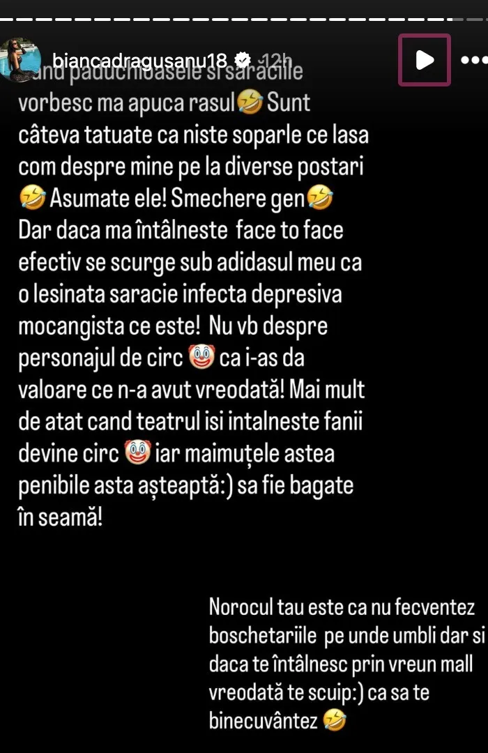 Mai mult de atât, când teatrul își întâlnește fanii devine circ. Iar mai maimuțele astea penibile asta așteaptă: să fie băgat în seamă! ”, a fost o parte din mesajul Biancăi Drăgușanu, postat pe Instagram.