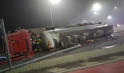 Accidentul a avut loc în zona localităţii Remuş din judeţul Giurgiu, unde o cisternă s-a răsturnat pe o parte, în apropierea sensului giratoriu cu DN 5D.