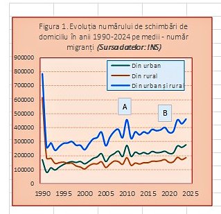 Tabloul general al schimbărilor de domiciliu în anii 1990-2024 este cel din figura 1. După explozia din mediul rural în anul 1990 fluxurile în cele două medii s-au calmat și nu diferă radical ca dimensiune iar dezvoltările ulterioare sunt similare. Vor fi folosiți termenii de plecați și sosiți. Plecații din mediul urban s-au impus ca număr după anul 1997 și au o superioritate moderată dar fermă și tendință continuă de creștere dar moderată. În mediul rural modesta creștere s-a instalat după anul 2005. Se pot observa recrudescența din anul 2010, în ambele medii, și reculul din anii Pandemiei, în zonele A și B. Creșterea consistentă a numărului de plecări în anul 2010 a survenit în contextul crizei financiare 2008-2010 care a dus, printre altele, la măsuri dure de austeritate, îndeosebi la tăierea salariilor cu 25% în sectorul bugetar și majorarea TVA de la 19% la 24%. Șomajul nu putea rămâne indiferent la măsuri atât de radicale și brutale.