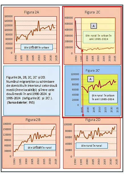 Dinamica din rural, în figurile 2C și 2D, pare diferită, cu creștere din rural în rural și progres minor din rural în urban după excepționala creștere din anul 1990. Avem aici un exemplu clar de modul în care o scară verticală cu valoare excepțională doar în primul an al seriei, 1990, estompează diferențierea dezvoltărilor din anii următori. Soluția este reconstruirea figurii 2C numai pentru anii 1995-2024. Este figura 2C’, în care apare clar diferențierea valorilor și alura progresivă a curbei migrației din rural în urban după anul 1990.