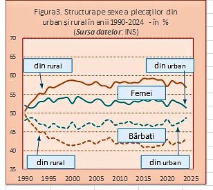 În populația țării proporția femeilor și cea a bărbaților au avut după anul 1990 valori foarte apropiate și stabile, 51 și 49 la sură. În context, este util de știut că la 1 ianuarie 2025 în întreaga populație pe vârste a țării, cea rezidentă în țară și cea rezidentă în alte țări, proporția bărbaților este mai mare, în jur de 51 la sută, până la vârsta de 53 ani, vârstă de la care proporția femeilor o depășește pe cea a bărbaților. Din 100 de născuți 51 la sută sunt băieți și 49 la sută sunt fete. Superioritatea bărbaților se menține până la vârsta de 53 ani după care proporțiile se inversează. Supramortalitatea masculină este factorul determinant al schimbării. În populația de migranți cu schimbare de domiciliu situația este considerabil diferită. Iată în figura 3 cum au evoluat proporția femeilor și cea a bărbaților la locuitorii plecați din urban și din rural. Sunt particularități semnificative între medii și între bărbați și femei. Creșterea proporției femeilor s-a declanșat rapid după anul 1989 și în jurul anului 2000 a ajuns la 57-58 la sută la plecările din rural. S-a menținut la aceste valori ridicate până în anul 2019, Pandemia a împins proporția la 57 la sută și a urmat declin moderat. Toate mișcările ascendente au avut drept urmare declinul proporției bărbaților plecați din rural. Și în mediul urban a existat o evoluție ascendentă a proporției femeilor plecate dar la un nivel net inferior.