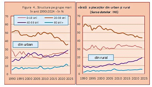 În structura pe vârste a plecaților și din urban și din rural au dominat și domină net în întreaga perioadă migranții în vârstă de 20-39 ani (figura 4). Sunt vârste de participare intensă la activități economice, inclusiv absolvenți de învățământ care intră în viața activă economic și își stabilesc un domiciliu. Nu știm, în lipsa datelor, în ce proporție acești plecați din urban au ajuns în alt urban sau în rural, după nu știm nici câți din cei plecați din rural au ajuns în alt rural ori în urban. Se poate admite că cei plecați din rural în urban au avut drept motivație majoră un loc de muncă. Ipoteza nu poate fi aceeași la cei plecați din urban în rural. În schimbarea domiciliului din urban în rural motivația a fost, probabil, abandonarea urbanului mare în favoarea unor localități rurale apropiate de marile orașe, localități mai puțin poluate, cu mai puțin zgomot, cu securitate personală mai bună, cu mai multă natură. Oricum însă, proporția plecaților în vârstă de 20-39 ani a cunoscut un recul în toată perioada la cei plecați din rural și recul instalat după anul 2014 la cei plecați din urban. Reculul relativ provine din progres al proporțiilor la celelalte 3 grupe de vârstă la plecații din urban și doar la grupele 40-59 ani și 60 ani și peste la plecații din rural. La celelalte grupe de vârstă se pot remarca alte câteva diferențieri între medii: •proporțiile ridicate la plecații foarte tineri, 0-19 ani, mai ridicate la cei plecați din rural; este probabil, drumul spre o educație superioară în urban; •adulții în vârstă de 40-59 ani plecați din urban au o pondere net superioară celor plecați din rural; curbele sunt în ascensiune la ambele medii; •o proporție mai mare a plecaților vârstnici din urban, probabil, prin pensionare; ambele curbe sunt în ascensiune moderată.