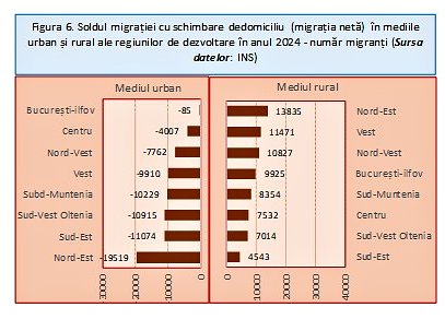 Dacă mutăm soldul migrației pe medii la nivelul celor 8 regiuni de dezvoltare diferențele sunt în favoarea ruralului în toate regiunile (figura 6) și în regiunea Nord-Est în special, regiune care are și soldul negativ cel mai mare în urban. Este o regiune cu o populație mare și cu multă mobilitate determinată de rațiuni economice. Regiunea București-Ilfov se remarcă prin sold negativ extrem de mic în urban și sold pozitiv median în rural.
