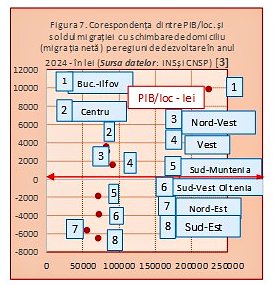 Putem înțelege mai bine desfășurările și particularitățile migrației cu schimbare de domiciliu pe regiuni de dezvoltare prezentate în articol corelând soldul migrației cu dezvoltarea economică a regiunilor folosind PIB-ul pe locuitor în anul 2024 în figura 7. Departajarea este netă: regiunea București-Ilfov și cele trei regiuni din Transilvania au migrație pozitivă iar celelalte 4 regiuni, din Estul și Sudul țării migrația este negativă. Situația economică precară împinge locuitorii acestor regiuni spre căutarea mai binelui în cele 4 regiuni mai dezvoltate (și în alte țări). Dacă ar fi publicate date, am putea urmări direcțiile fluxurilor de migranți din județele acestor regiuni către județele din cele patru regiuni cu migrație netă pozitivă. Cititorii interesați de date la nivelul județelor doar asupra numărului plecaților și sosiților le pot examina în ANEXĂ.