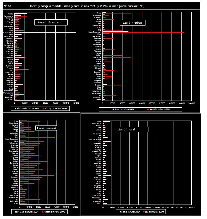 Plecați și sosiți în mediile urban și rural în anii 1990 și 2024 pe județe