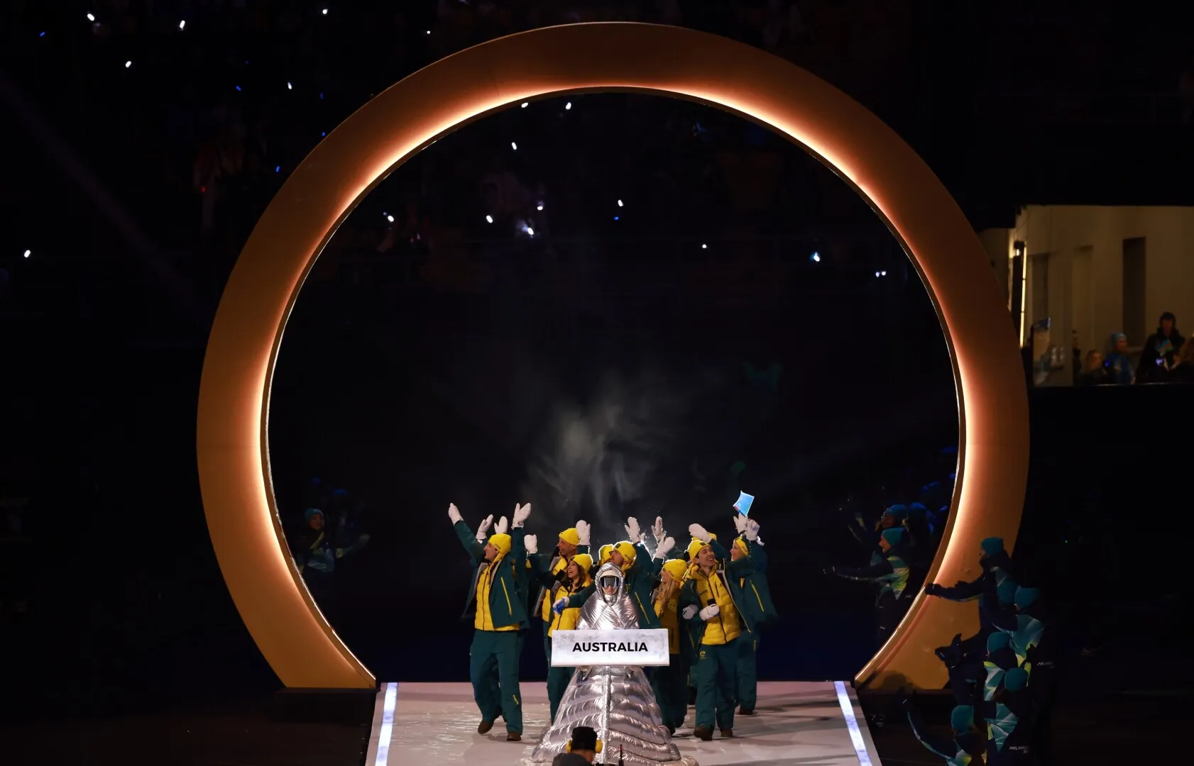 Imnul naţional italian a fost cântat simultan atât în Milano (de Laura Pausini), cât şi în Cortina d'Ampezzo (de un cor montan), în timp ce steagul a fost înălţat.