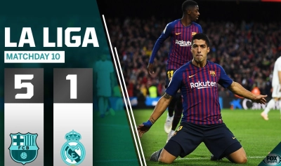 FC Barcelona a învins, duminică, pe teren propriu, cu scorul de 5-1, echipa Real Madrid, într-un meci din etapa a zecea a campionatului Spaniei, în care Luis Suarez a înscris trei goluri, unul dintr-un penalti acordat după consultarea VAR.