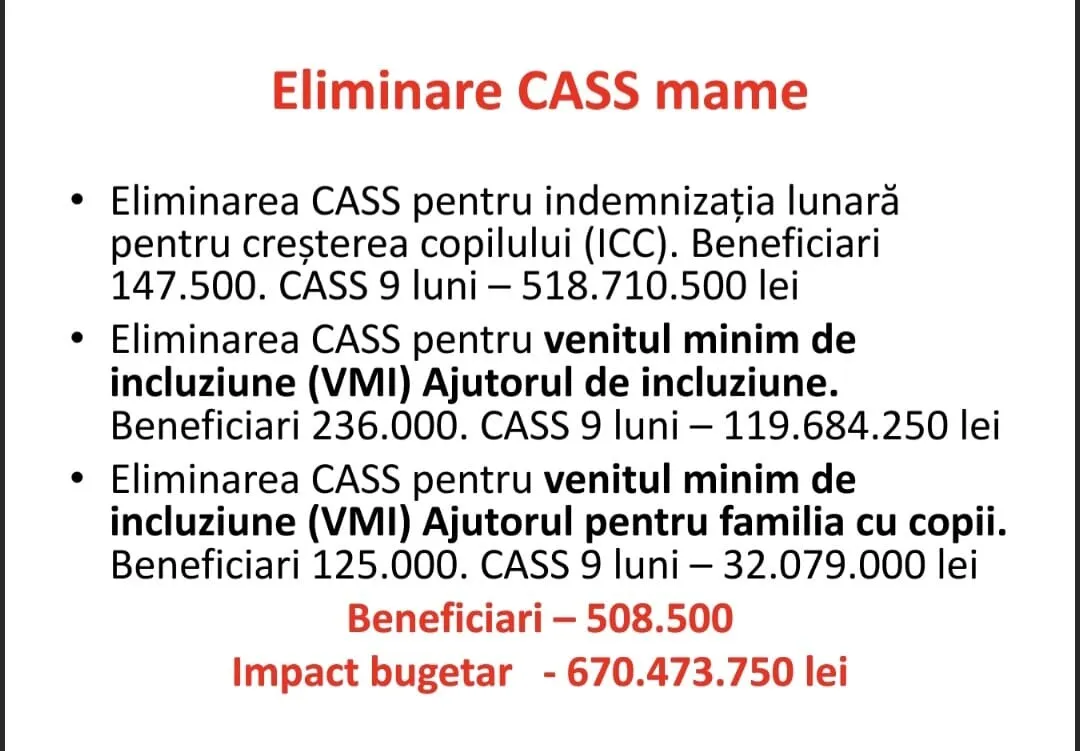 Una dintre deciziile centrale este eliminarea contribuţiei la asigurările sociale de sănătate (CASS) pentru mai multe categorii de beneficiari. Astfel, CASS ar urma să fie eliminată pentru indemnizaţia lunară de creştere a copilului, măsură care ar viza aproximativ 147.500 de persoane şi ar avea un impact bugetar de peste 518 milioane de lei pentru nouă luni.