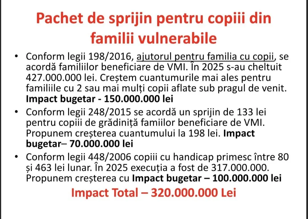 Impactul bugetar estimat pentru această categorie este de 100 de milioane de lei. În total, pachetul dedicat copiilor din familii vulnerabile ar presupune un impact bugetar de 320 de milioane de lei.
