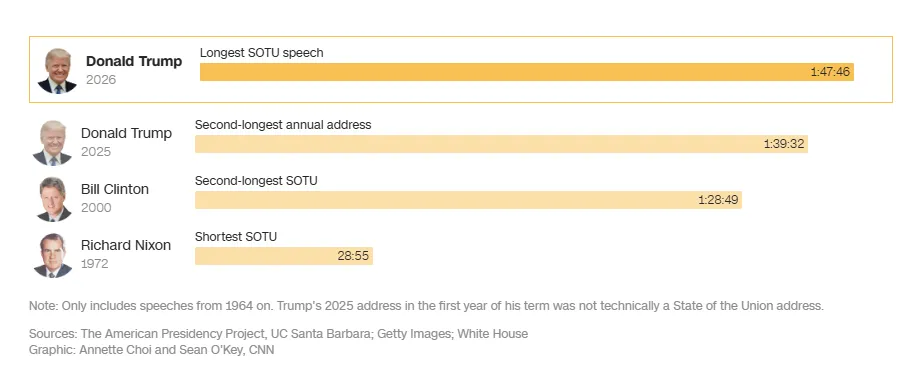 Totodată, preşedintele republican şi-a doborât şi propriul record de anul trecut pentru un discurs prezidenţial în faţa Congresului, pe care l-a ţinut la câteva săptămâni după învestire şi care, tehnic vorbind, nu a fost un discurs despre Starea Naţiunii. Discursul de anul trecut a durat 99 de minute.