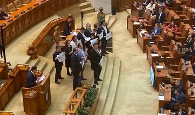 Zeci de parlamentari din opoziție - AUR, SOS, POT, PACE - au protestat zgomotos, miercuri, în plenul reunit al Senatului şi Camerei Deputaţilor care urmează să se pronunţe asupra dislocării temporare în România a unor echipamente şi forţe militare americane, în contextul conflictului din Orientul Mijlociu.